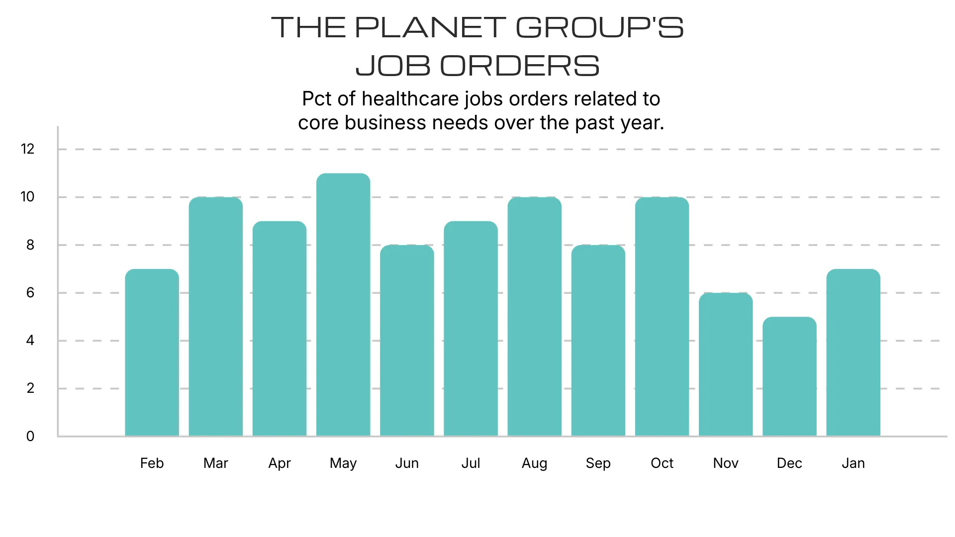 Below is data on the percentage of job orders taken month-over-month over the past year related to support and business operations within the healthcare sector.