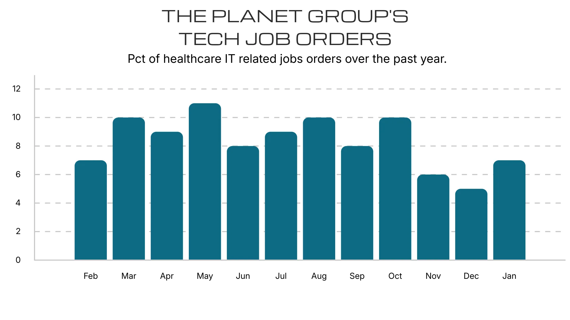 Below is data on the percentage of job orders taken month-over-month over the past year related to technology positions within the healthcare sector.